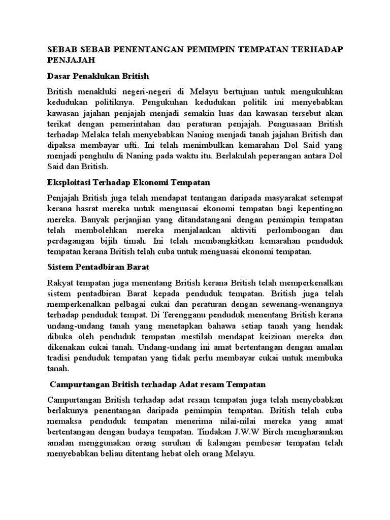 Semoga perkongsian bahan-bahan rujukan panduan bahan pembelajaran dan pengajaran contoh-contoh karangan sumber rujukan SPM Sijil. Penentangan ini berlaku secara bersama oleh pembesar dan sultan. Sebab-sebab penentangan masyarakat tempatan terhadap British.